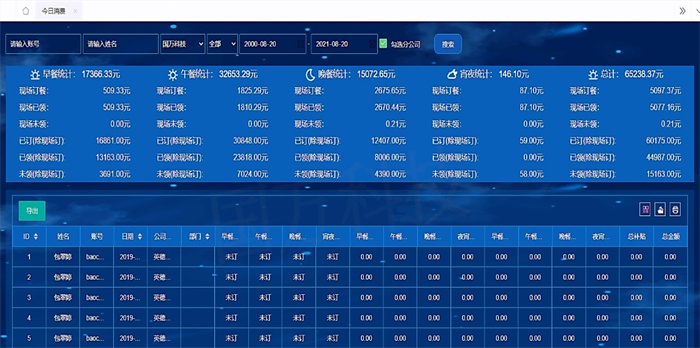 首先是今日食堂的消費(fèi)統(tǒng)計(jì),分成兩個(gè)部分,上半部分是員工的總消費(fèi)統(tǒng)計(jì),包括早、中、晚每個(gè)餐次的數(shù)據(jù)都標(biāo)得明白清楚;下半部分就是個(gè)人或部門的消費(fèi)數(shù)據(jù),只要選擇或輸入想查的信息即可。另外,如果想要導(dǎo)出數(shù)據(jù)的話,直接點(diǎn)擊“導(dǎo)出”就可以啦~是不是既簡(jiǎn)單又快捷呢?