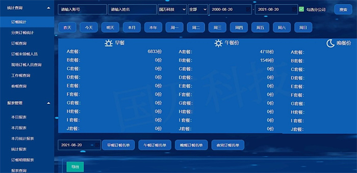 訂餐包括訂餐統(tǒng)計(jì)、分類統(tǒng)計(jì)、訂餐查詢、訂餐未領(lǐng)餐人員、工作餐客餐查詢等,每一個(gè)功能都是遞進(jìn)管理的哦!比如第一個(gè)是訂餐統(tǒng)計(jì),統(tǒng)計(jì)早、中、晚三餐的數(shù)據(jù);第二個(gè)分類統(tǒng)計(jì)就是某一類早餐被員工購(gòu)買消費(fèi)的數(shù)據(jù)……功能們各司其職,讓您的食堂有序運(yùn)轉(zhuǎn)、管理輕松進(jìn)行。