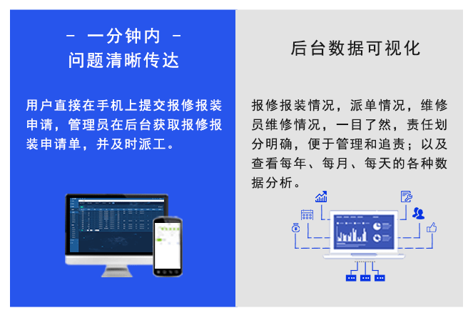 在線(xiàn)報(bào)修報(bào)裝系統(tǒng),可幫助企業(yè)實(shí)現(xiàn)輕松、規(guī)范、細(xì)致的報(bào)修、派單、接單、維修報(bào)裝、評(píng)價(jià)等一體化管理工作,提高管理效率、實(shí)時(shí)掌握、準(zhǔn)確、全面的報(bào)修報(bào)裝進(jìn)度,高效控制報(bào)修報(bào)裝全部過(guò)程。